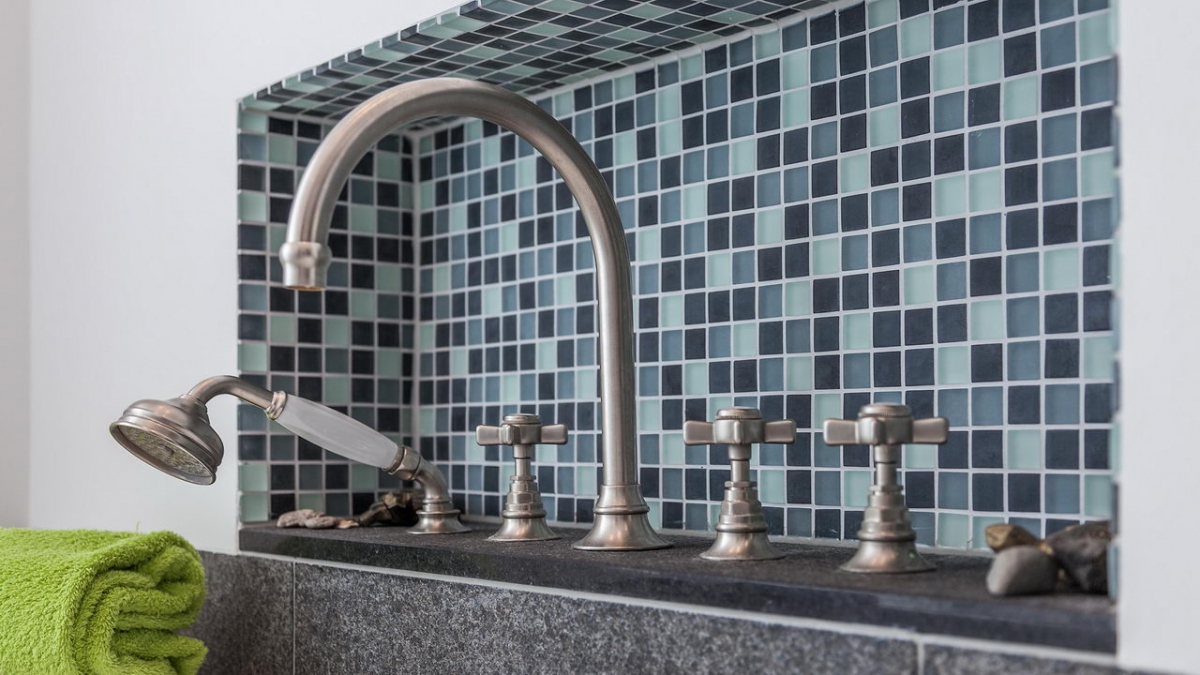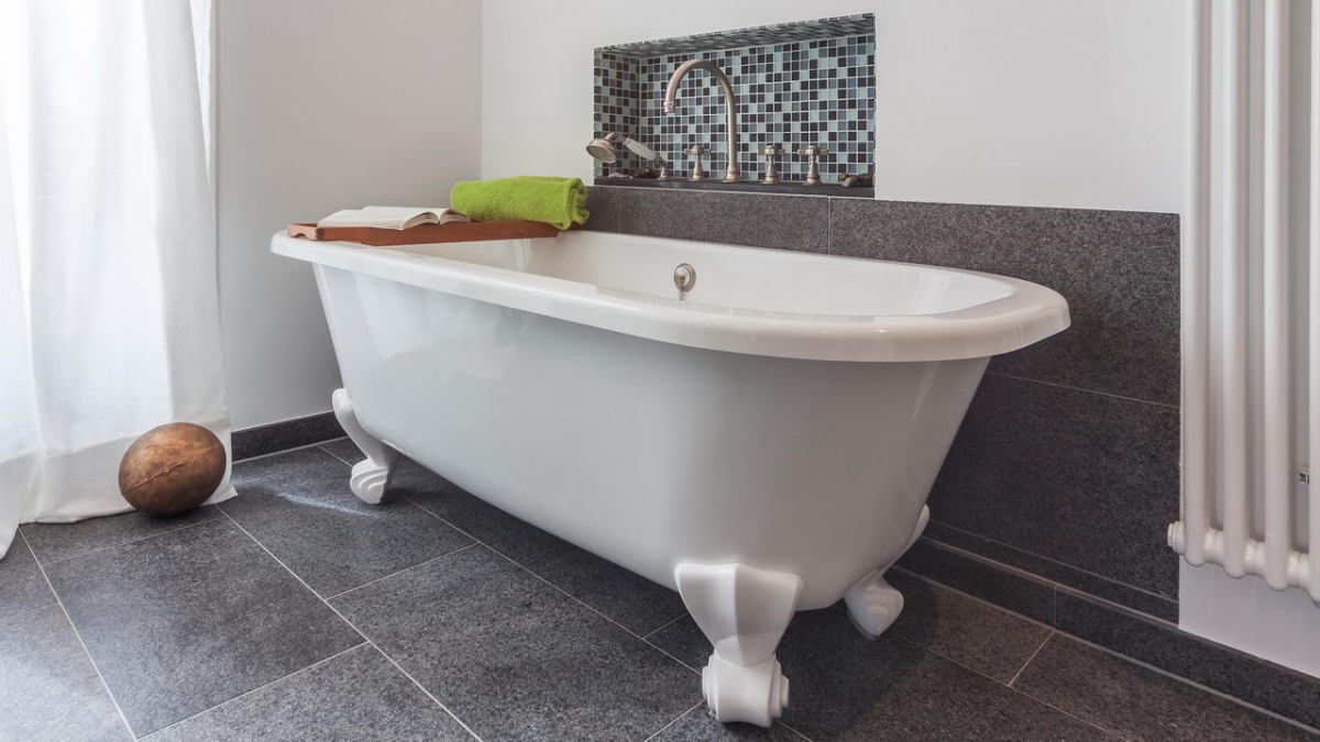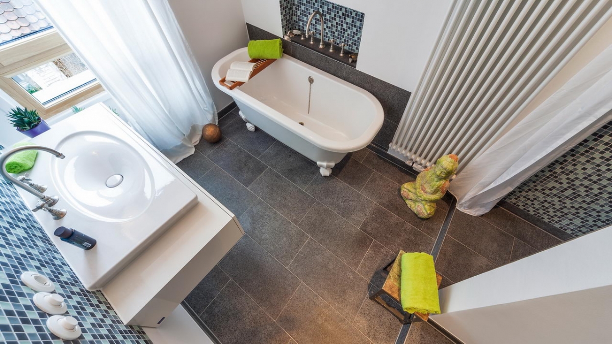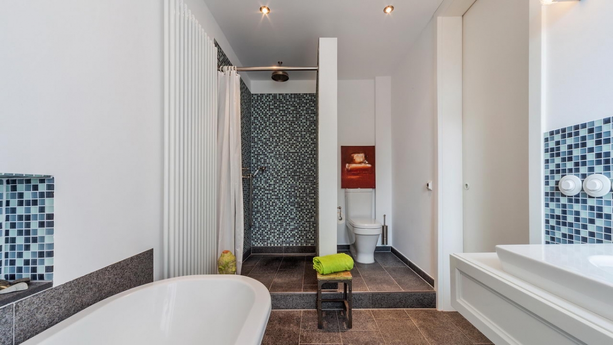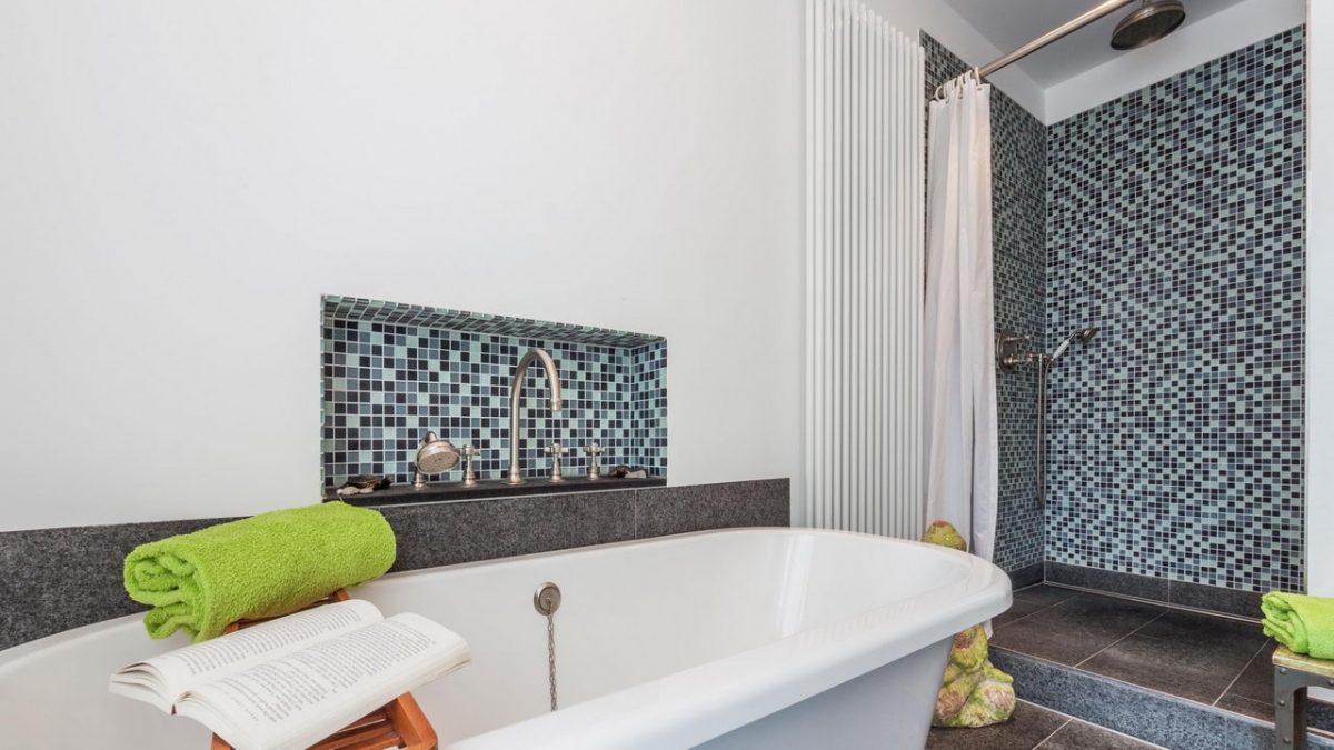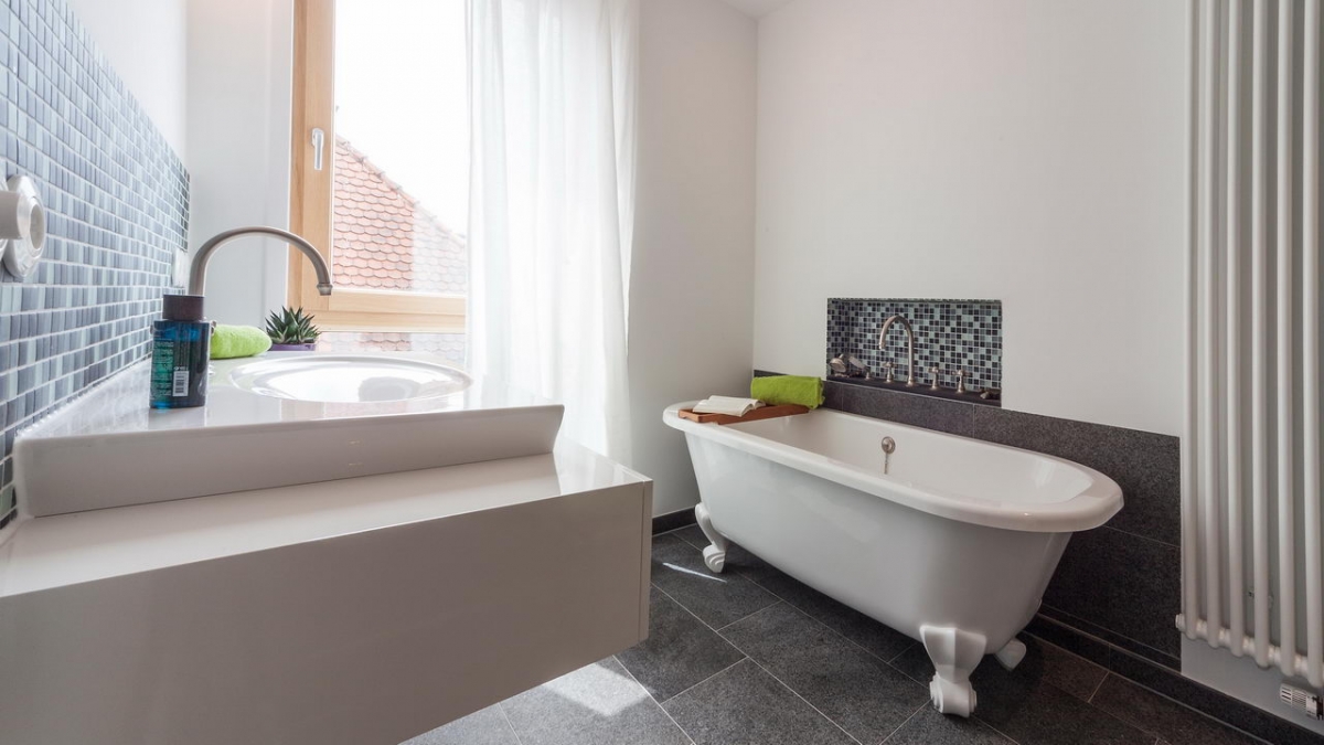 Das alte Bad war bei der Wohnungsübernahme schon nicht mehr vorhanden, der Raum behielt aber noch einige Überraschungen für sich. Möglichst durchgängig im Retrolook war der Wunsch. So kam es zu einer Badewanne auf Löwenfüßen, Armaturen in Edelstahloptik, einem Stand-WC mit aufgesetztem Spülkasten und passenden Lichtschaltern und Steckdosen. Natürlich war der Duschvorhang einer Glasabtrennung an der erhöht gefliesten Dusche vorzuziehen. Das Podest wurde technisch notwendig. Blaues Glasmosaik neben weißem Malervlies bestimmen die Wände und sorgen für nicht ganz retrokonformen, aber stimmigen Kontrast. Ein Elternbad, das zum Verweilen einlädt, um die vielen kleinen Details zu entdecken.