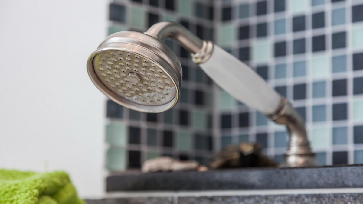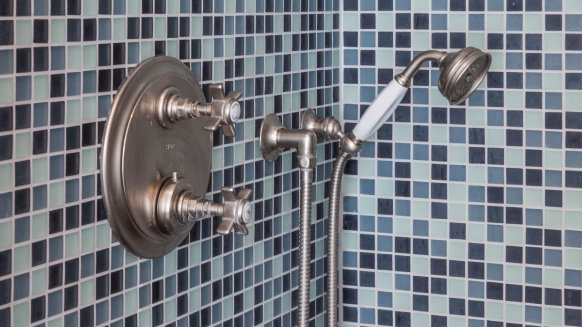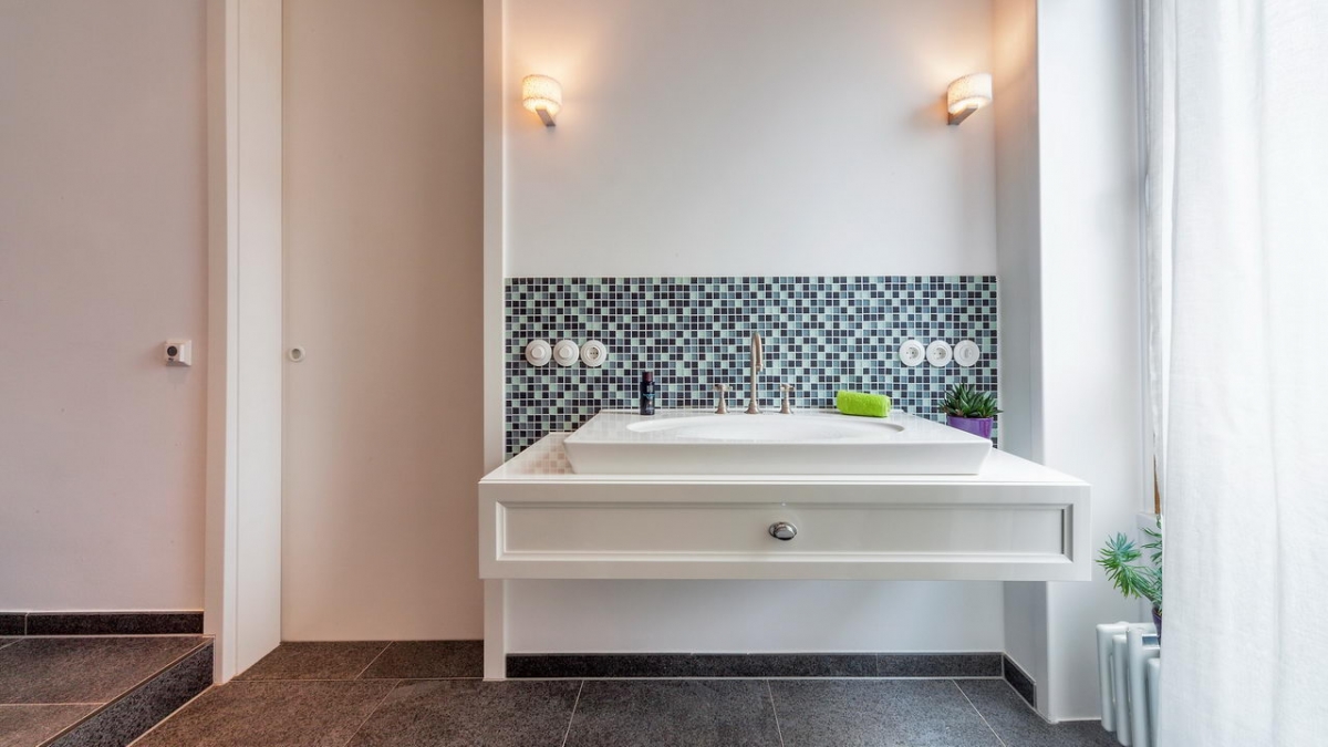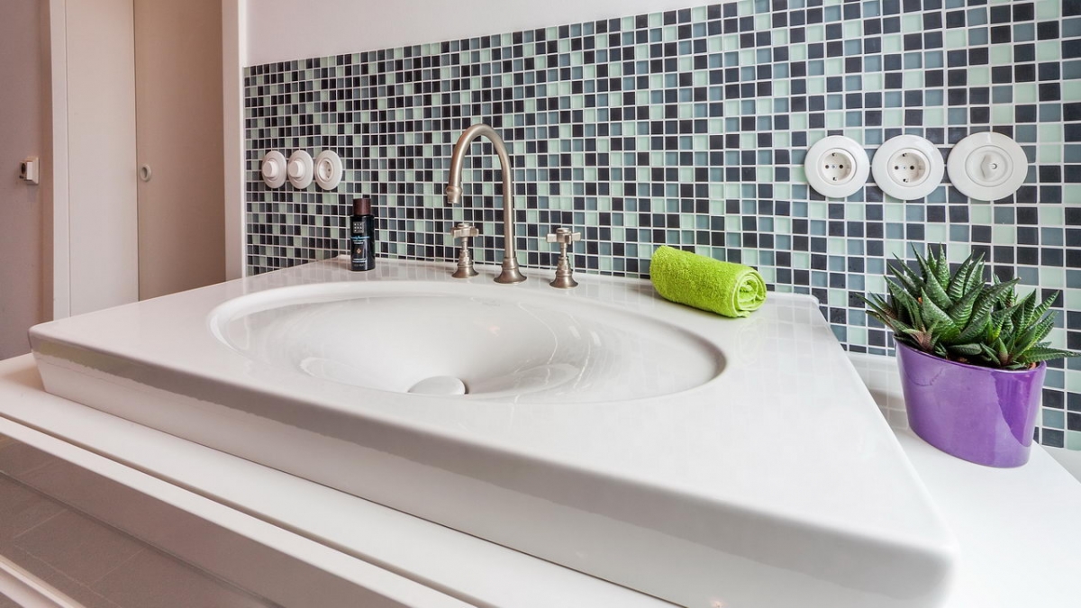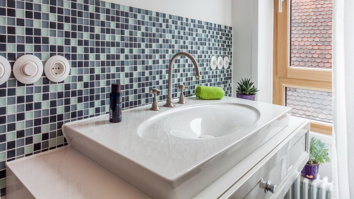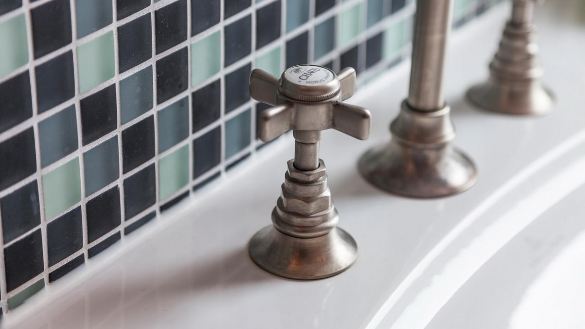 Das alte Bad war bei der Wohnungsübernahme schon nicht mehr vorhanden, der Raum behielt aber noch einige Überraschungen für sich. Möglichst durchgängig im Retrolook war der Wunsch. So kam es zu einer Badewanne auf Löwenfüßen, Armaturen in Edelstahloptik, einem Stand-WC mit aufgesetztem Spülkasten und passenden Lichtschaltern und Steckdosen. Natürlich war der Duschvorhang einer Glasabtrennung an der erhöht gefliesten Dusche vorzuziehen. Das Podest wurde technisch notwendig. Blaues Glasmosaik neben weißem Malervlies bestimmen die Wände und sorgen für nicht ganz retrokonformen, aber stimmigen Kontrast. Ein Elternbad, das zum Verweilen einlädt, um die vielen kleinen Details zu entdecken.