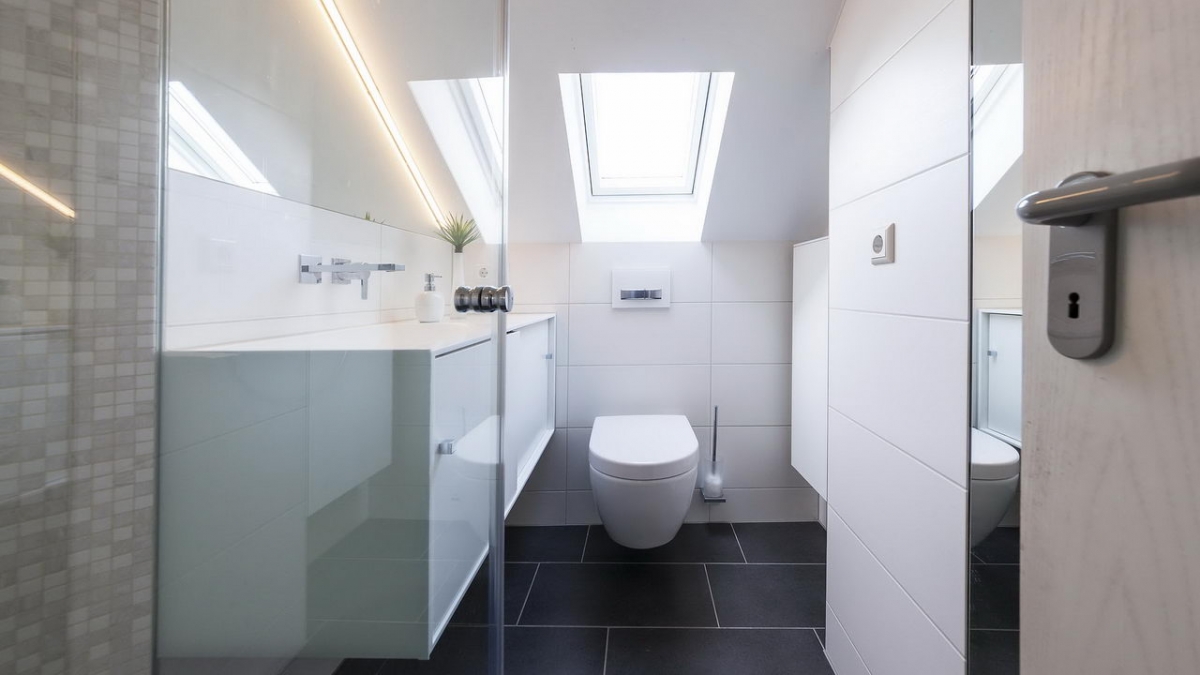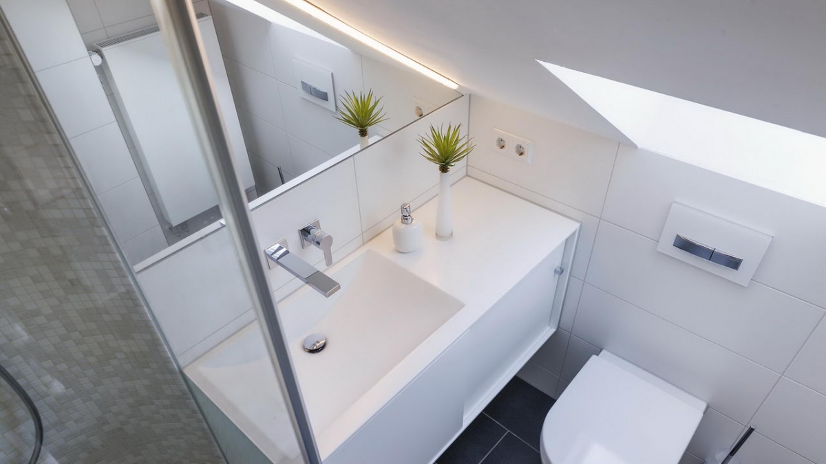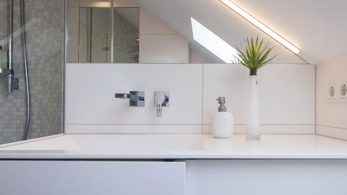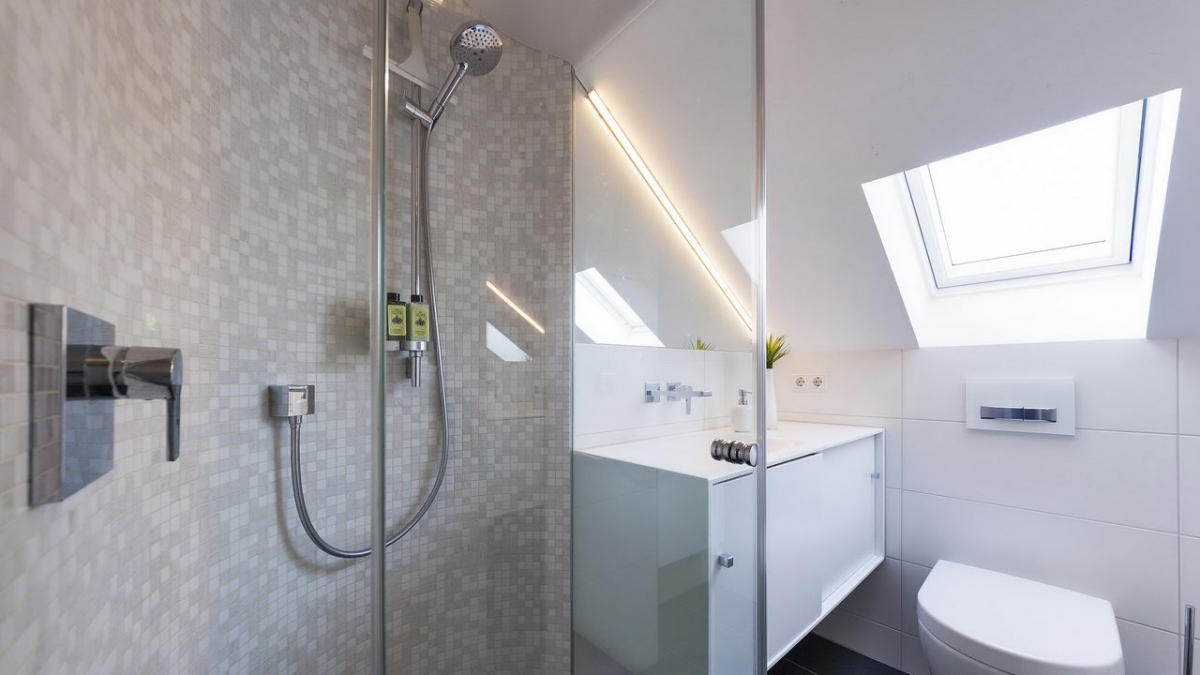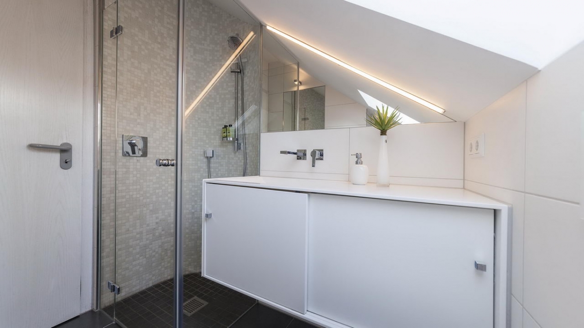 Die bodengleiche Dusche wurde am Zugang begradigt, um im Raum mehr Platz zu schaffen, die Wände mit Glasmosaik gefliest und die Seitenwand der Duschabtrennung mit einer Teilsatinierung direkt an dem maßgefertigten Mineralguss-Waschtisch angebracht. Das erleichtert die Reinigung in der Dusche und sorgt für optimale Raumausnutzung. Der eingepasste Spiegel unter der Dachschräge mit der LED-Beleuchtung sowie der Ganzkörperspiegel gegenüber der Dusche vergrößern den Raum optisch.