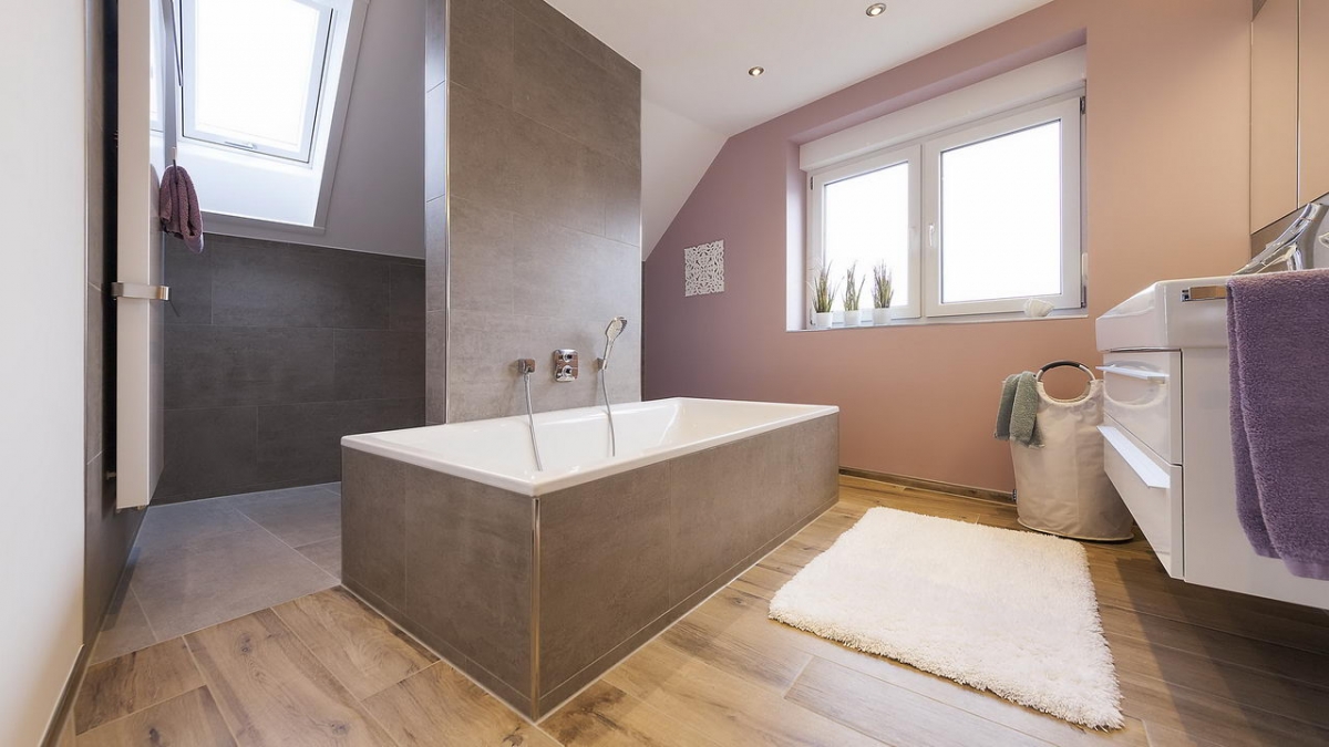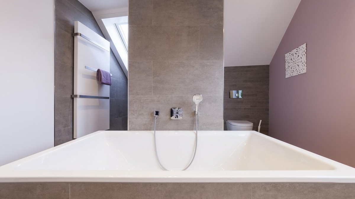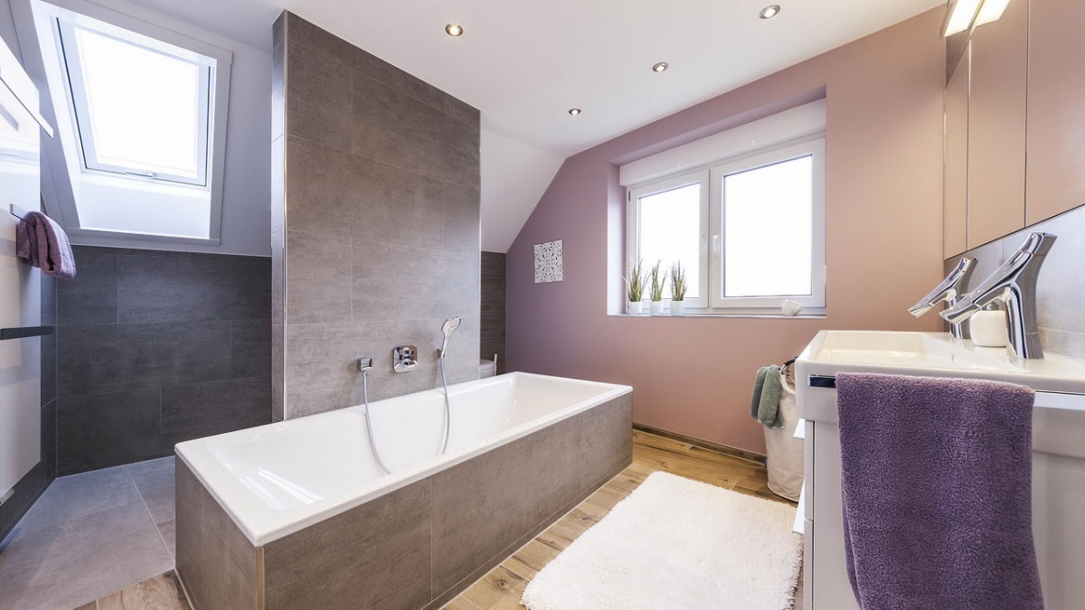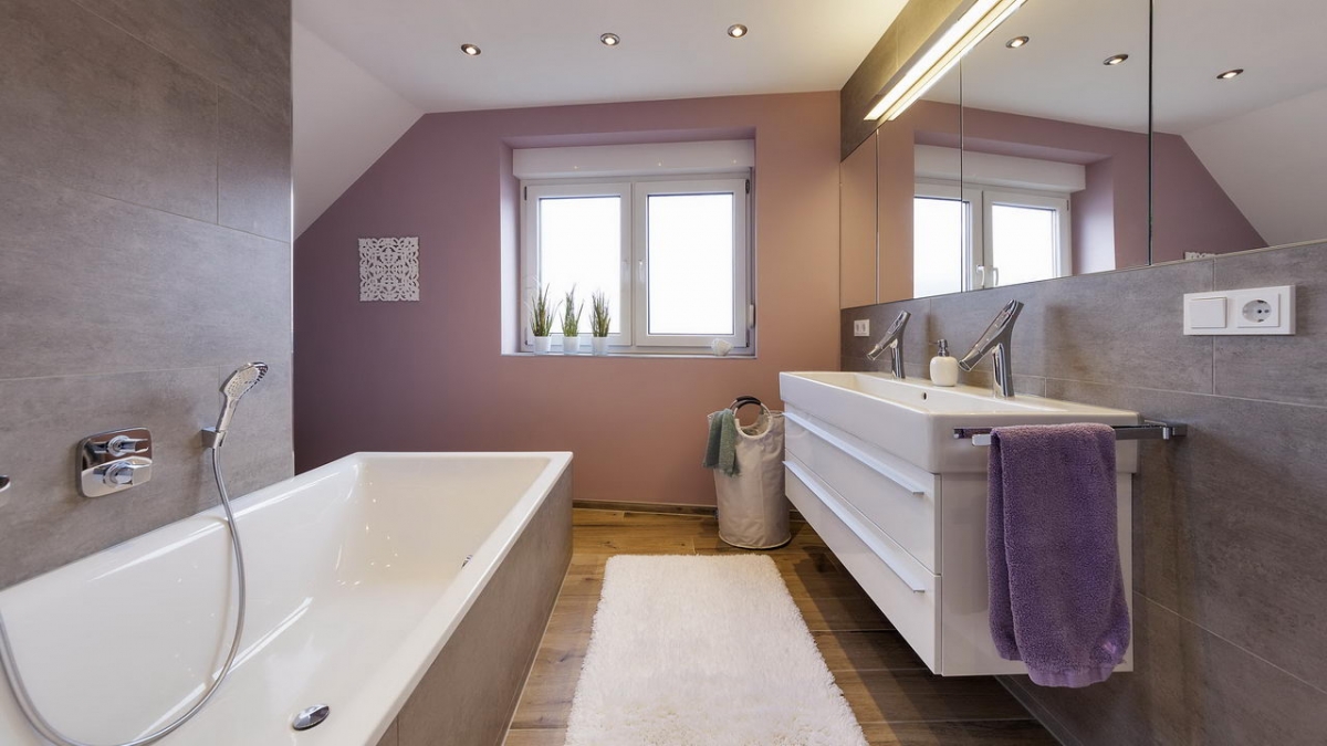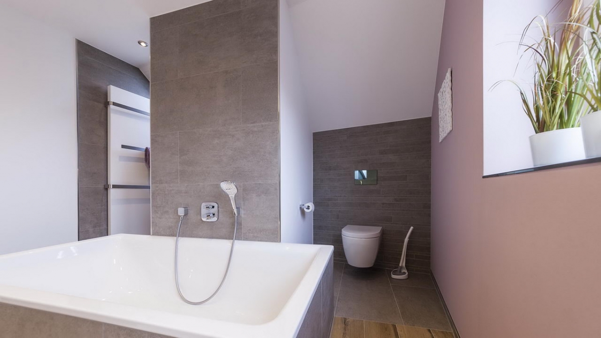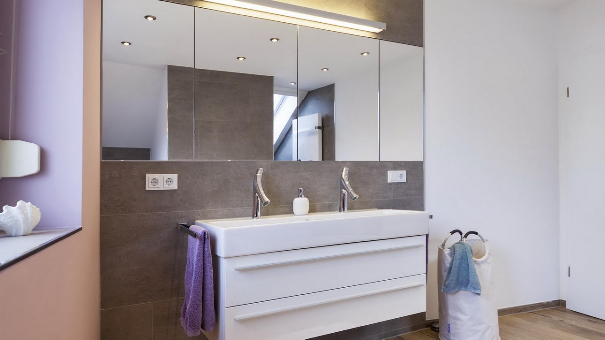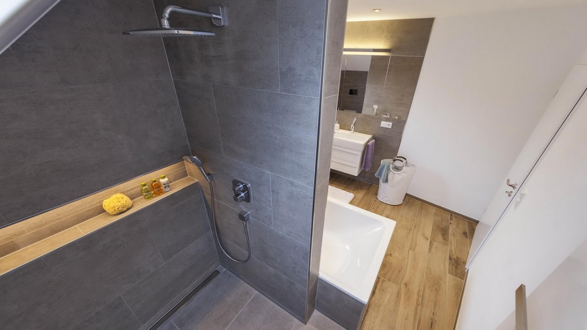 Eine gänzlich neue Raumanordnung um eine zentral platzierte großzügige Badewanne (2 x 1m) mit schräg angeordneten Einrichtungen gibt dem Badezimmer nun einen ganz neuen Charakter. Die große, bodeneben geflieste Dusche unter der Dachschräge ist so angeordnet, dass auf eine Duschabtrennung verzichtet wurde. Das zusätzliche Dachfenster sorgt für ausreichend Tageslicht im Duschbereich, der durch die zusätzliche Akzentbeleuchtung einen Eindruck von Geborgenheit und Privatsphäre vermittelt. Das WC versteckt sich nun in einer Nische und so „thront“ der Nutzer nicht offensichtlich frei im Raum. Über dem Doppelwaschtisch verbirgt sich ein flächenbündiger Einbau-Spiegelschrank der einiges an Stauraum bietet. Die farblich abgesetzte Außenwand und Fliesen in Holzoptik geben dem Raum einen wohnlichen Charakter.