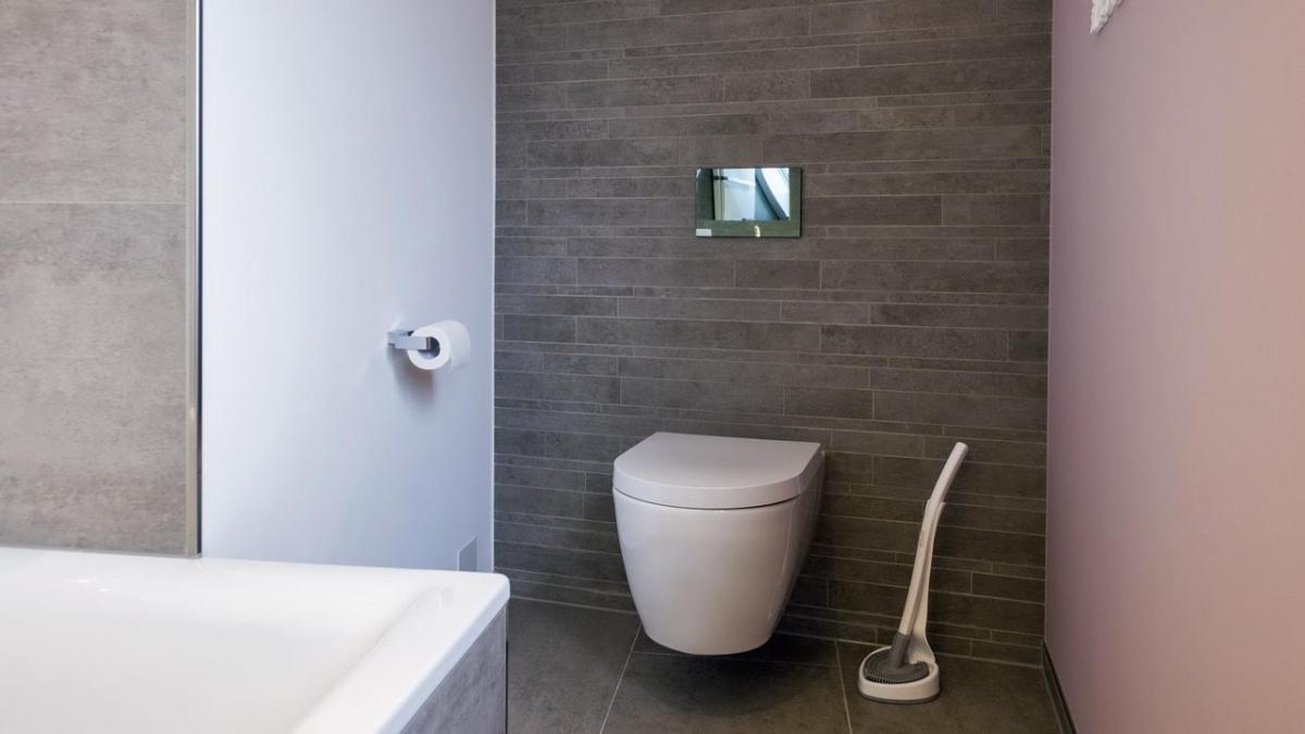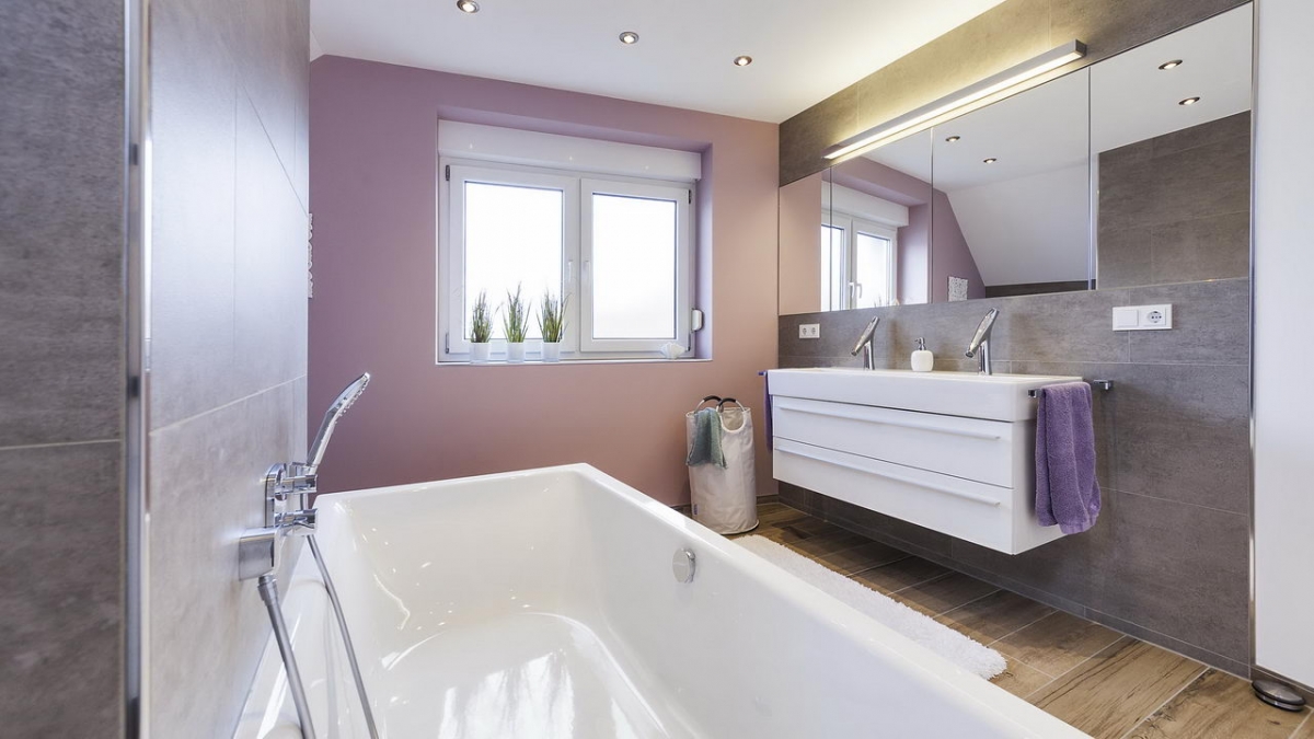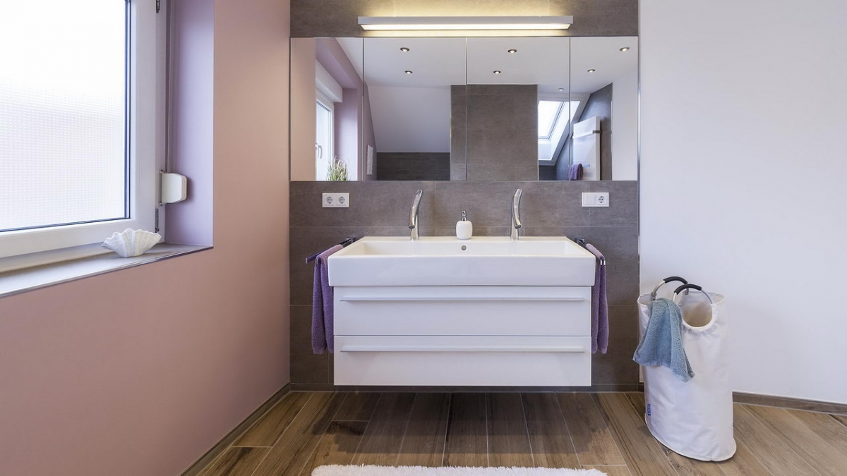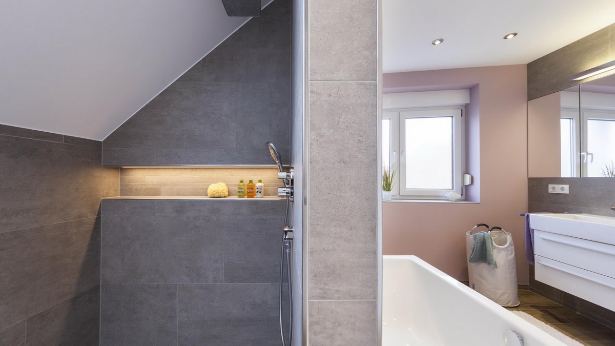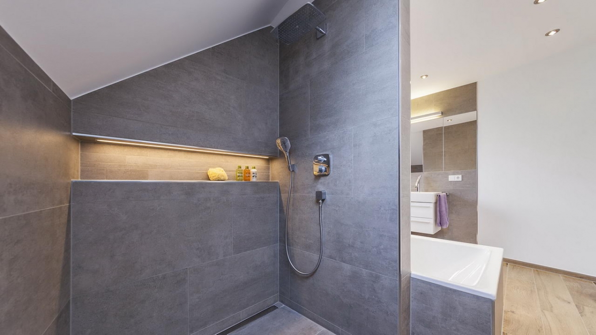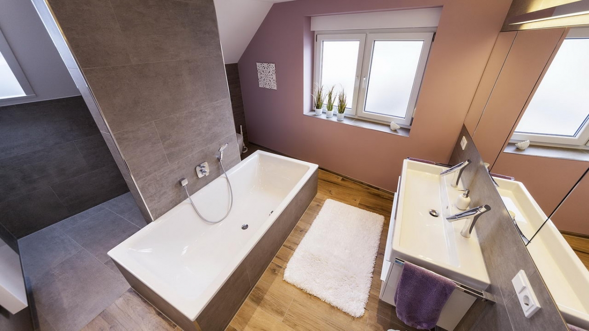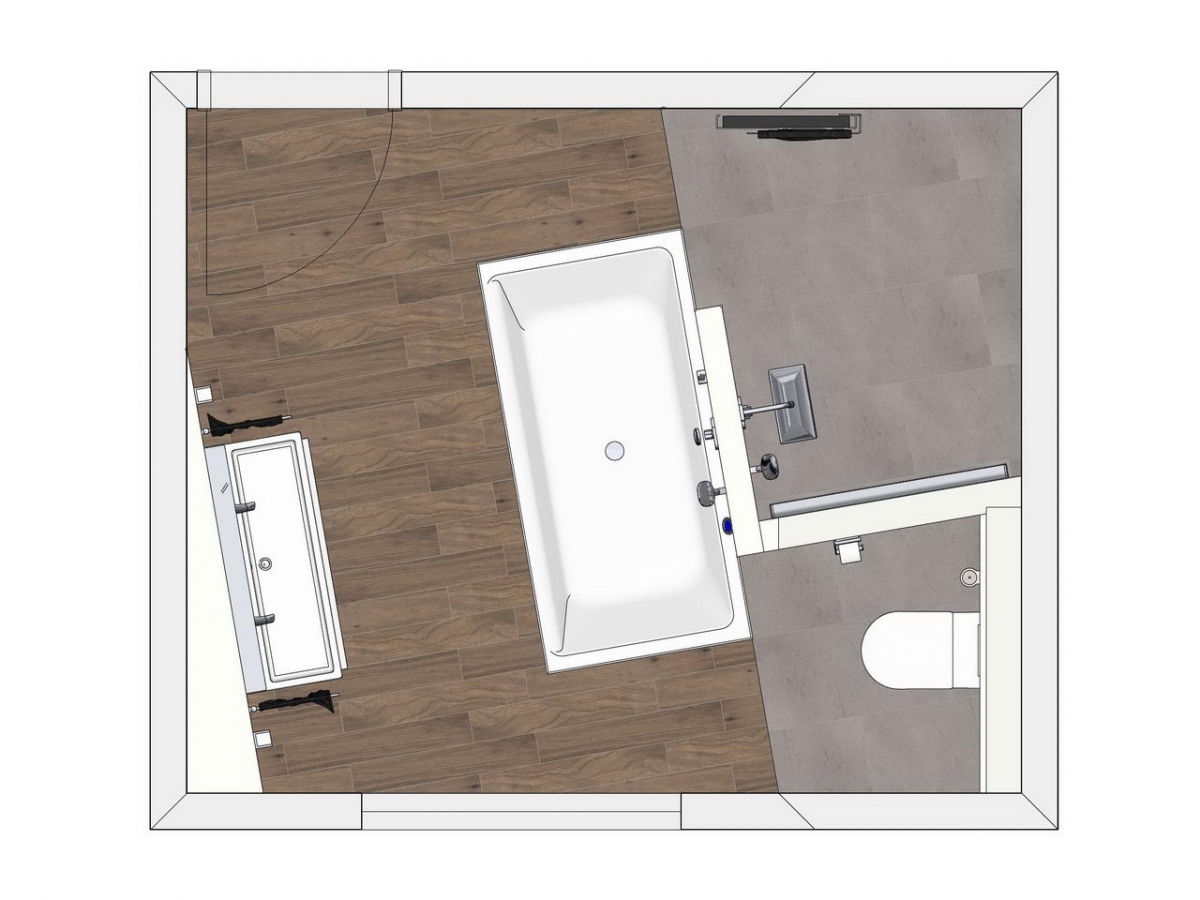 Eine gänzlich neue Raumanordnung um eine zentral platzierte großzügige Badewanne (2 x 1m) mit schräg angeordneten Einrichtungen gibt dem Badezimmer nun einen ganz neuen Charakter. Die große, bodeneben geflieste Dusche unter der Dachschräge ist so angeordnet, dass auf eine Duschabtrennung verzichtet wurde. Das zusätzliche Dachfenster sorgt für ausreichend Tageslicht im Duschbereich, der durch die zusätzliche Akzentbeleuchtung einen Eindruck von Geborgenheit und Privatsphäre vermittelt. Das WC versteckt sich nun in einer Nische und so „thront“ der Nutzer nicht offensichtlich frei im Raum. Über dem Doppelwaschtisch verbirgt sich ein flächenbündiger Einbau-Spiegelschrank der einiges an Stauraum bietet. Die farblich abgesetzte Außenwand und Fliesen in Holzoptik geben dem Raum einen wohnlichen Charakter.