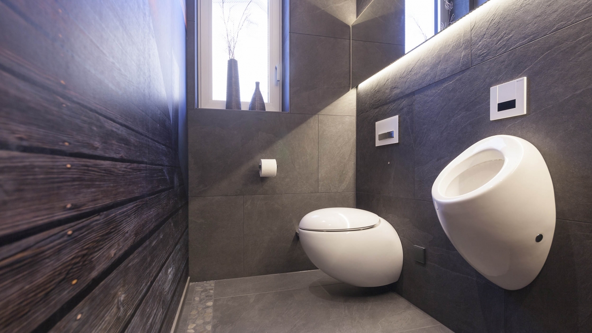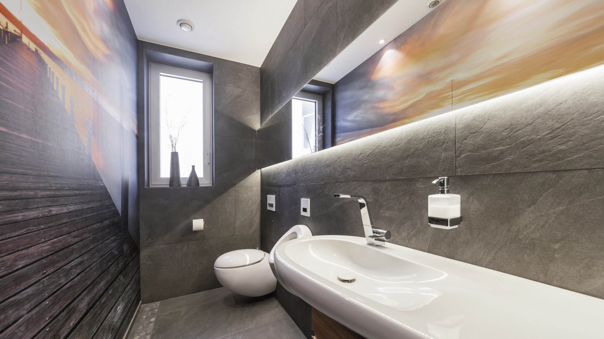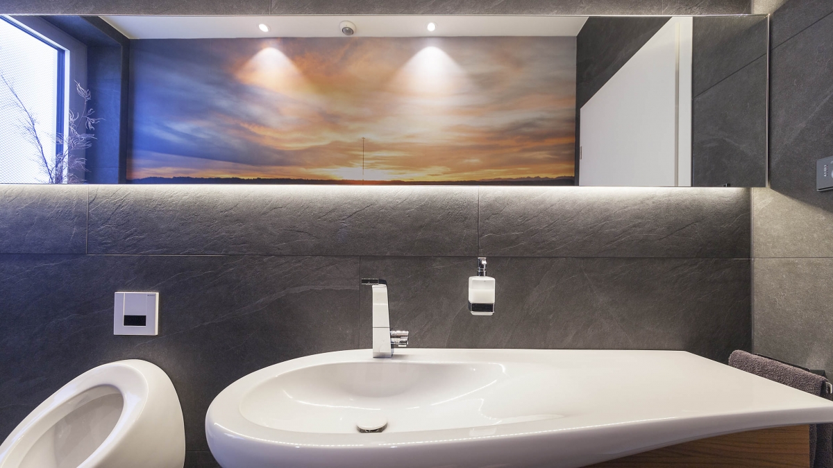 Ein Kunden- und Mitarbeiter-WC im Büro. Boden und Wand sind identisch gefliest. Die Fototapete lockert den schlauchförmigen Raum auf und kommt beim direkten Blick in den hinterleuchteten Spiegel richtig zur Geltung, da der Raum in diesem Moment eine optische Weite erfährt. Die runde Formgebung der Keramik fügt sich wie die Kieselsteine am Boden in die Szene eine. Die mit ihrer klaren Kantenführung eher maskulin wirkende Waschtischarmatur spiegelt den Nutzer wieder. Der Waschtischunterschrank bietet den notwendigen Stauraum für Reinigungsmittel und Handtücher.