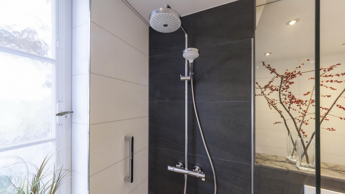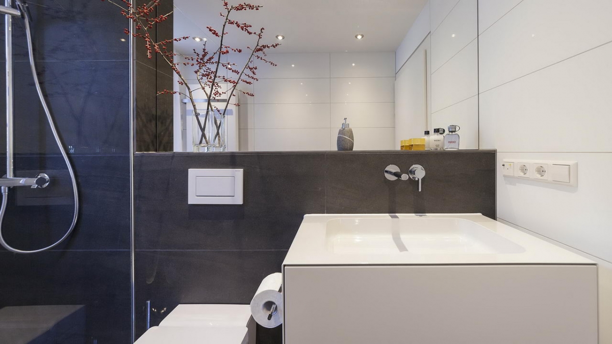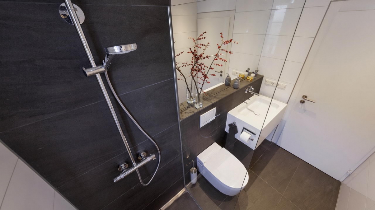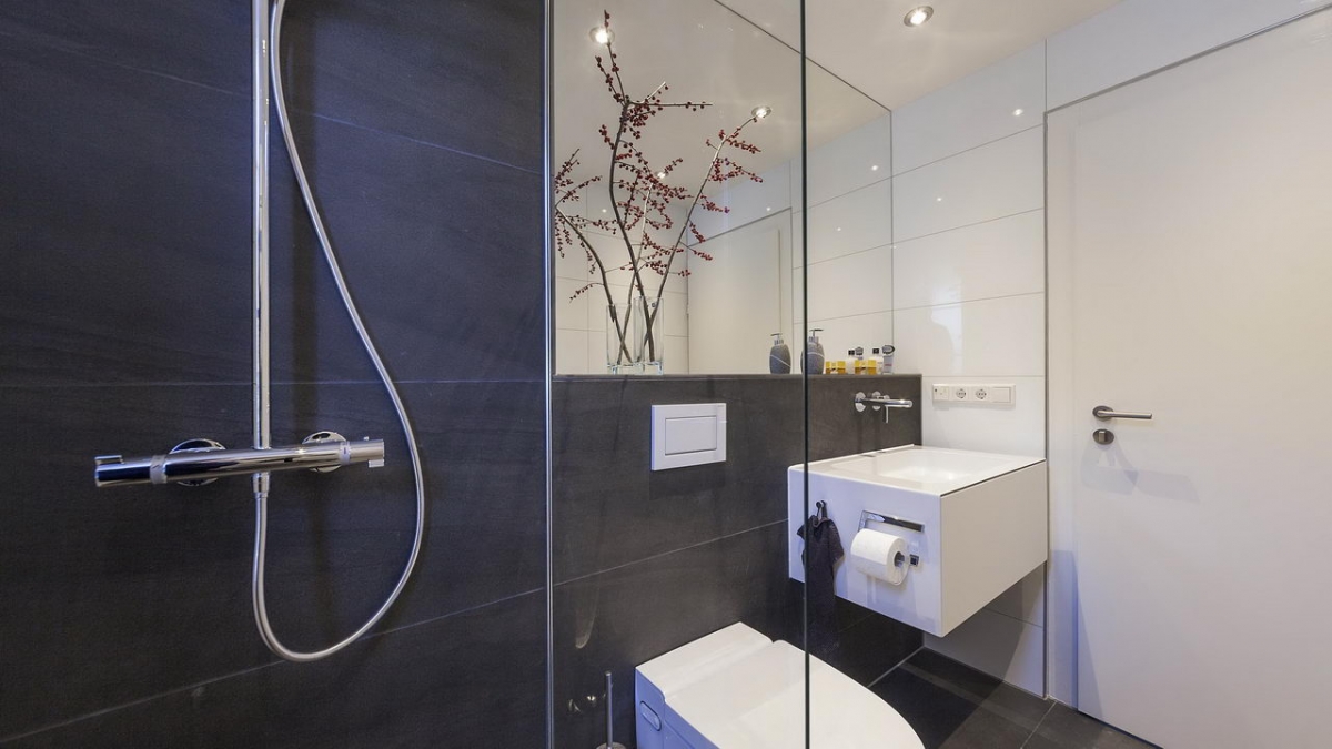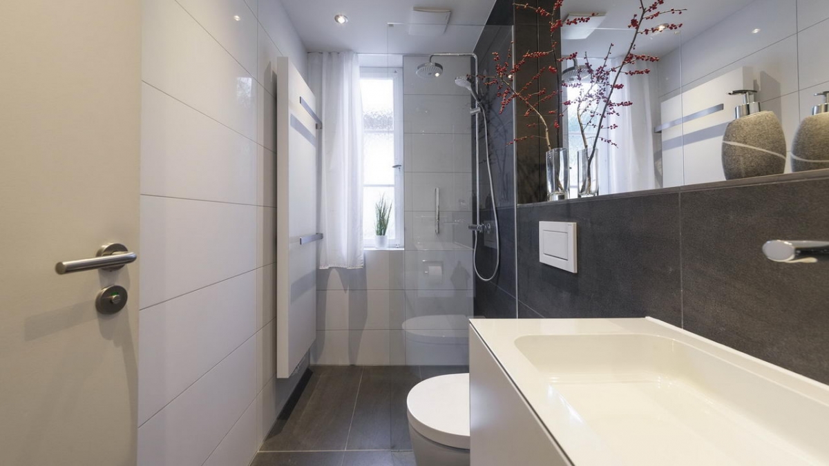Das ursprünglich vorhandene Gäste-WC mit davor befindlicher Garderobe im Erdgeschoss eines historischen Gebäudes sollte vorbeugend in ein Duschbad mit Blick auf die Zukunft umgebaut werden. Also, Trennwand raus und in die vorhandene Türzarge der Garderobe ein neues Türblatt einbauen – der Raum steht. Der entstehende Schlauchcharakter des Badezimmers wird durch den großen, deckenhohen Spiegel über der Ablage aufgelöst. Das komfortable Dusch-WC sorgt für eine erfrischende Intimhygiene. Der großzügige Waschtisch aus hochwertigem Stahlemail in Kombination mit der Wandarmatur erfüllt das knappe Platzangebot neben der Zimmertür. Um das historische Holzfenster am Duschbereich zu schützen ist ein Duschvorhang in einer deckenintegrierten Schiene angebracht und gibt dem Raum zusätzlich einen wohnlichen Charakter. Um die empfindliche Bausubstanz zu schützen, wurde ein Abluftventilator vorgesehen und raumhoch gefliest. Eine Auflockerung erfährt das Badezimmer durch die Verlegung der Bodenfliesen an der Vorwand.